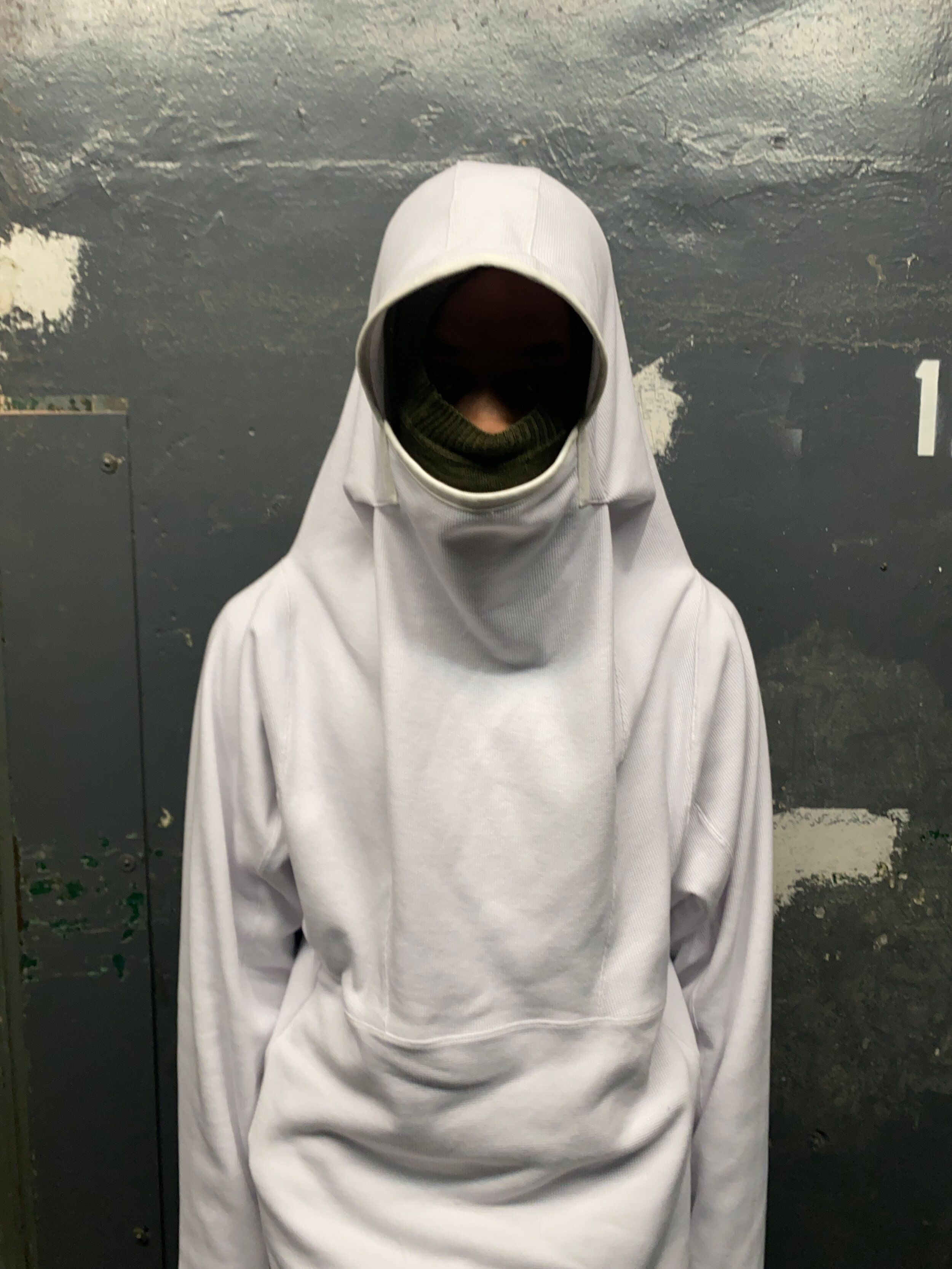 man wearing white armstrong hoodie and pilot balaclava from bryan jimenez fall/winter 2022